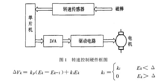 設(shè)給定轉(zhuǎn)速為 Ng ,則給定的旋轉(zhuǎn)周期為:Tg =60000/Ng(m s);設(shè)第 K 圈的周期為 T k ,則第 k 次誤差為 :Ek =Tg -Tk (ms)。Ek -1為第 K -1 次誤差,kp 為比例系數(shù) ,ki 為積分系數(shù), Vk 為第 K 次電壓增量。