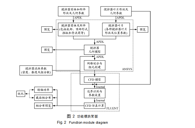 APDL,完成 FLUENT 軟件的前處理模塊,實現攪拌器葉片、筒體的建模,網格劃分和組元創建;然后通過后臺調用 FLUENT 運行日志文件,實現流體流場仿真運算與結果后處理.