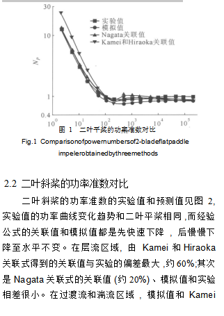比較寬泛的雷諾數(shù)區(qū)域比較準(zhǔn)確地預(yù)測二葉平槳的功率準(zhǔn)數(shù), Kamei和 Hiraoka關(guān)聯(lián)式能夠?qū)^渡流和湍流區(qū)域的功率準(zhǔn)數(shù)進(jìn)行合理的預(yù)測。