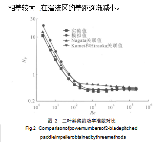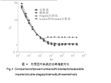 2.4 雙層四葉斜槳的功率準(zhǔn)數(shù)對比從圖 4可以看出,在層流區(qū)域 ,模擬值和 Nagata